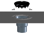 Těleso balkonového a terasového vtoku DN75/110 se svislým odtokem a s asfaltovou izolační manžetou. Plochý záchytný koš a fixační spony jsou v balení.